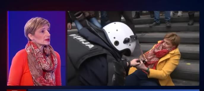 Inače, sve vreme dok je to govorila emitovana je takozvana pokrivalica sa jučerašnje blokade suda u Novom Sadu gde se vidi Rakićeva koja se, zajedno sa svojim koleginicama, otima oko štita sa policajcem.