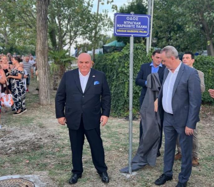 Tablu sa imenom Dragana Markovića Palme tada su na prigodnoj svečanosti pre dve godine otkrili gradonačelnik grada Katerini Konstantinos Kuokodimos na čijoj teritoriji se nalazi ova ulica duga 6,5 kilometara i Dragan Marković Palma.