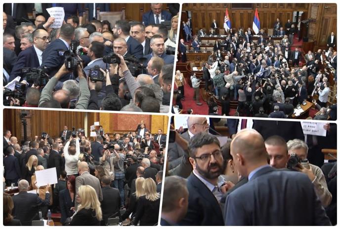 Došlo je do guranja i na balkonu skupštine i otimanja transparenta koji su poslanice pokušale da postave, a na kom je pisalo: "Žuti lopovi hoće rat, Srbija hoće rad".