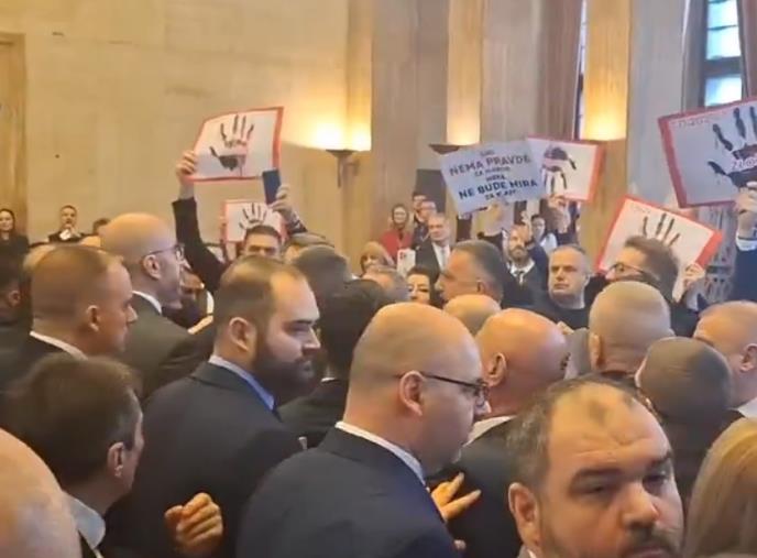 Kada predlog nije prihvaćen opozicioni poslanici u podigli transparente koje su uneli, koje su predstavnici vladajuće većine počeli da cepaju. Tada je i došlo do koškanja i razmene udaraca, a razdvojilo ih je skupštinsko obezbeđenje.
