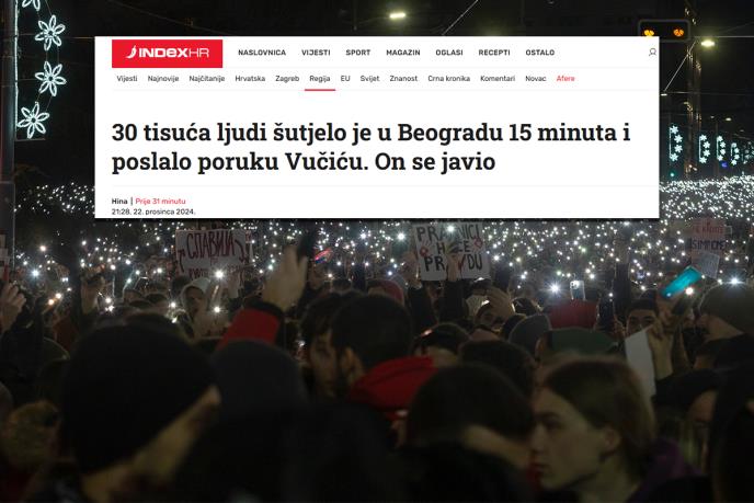 Portal "Index" u naslovu kaže: "30 hiljada ljudi ćutalo je u Beogradu 15 minuta i poslalo poruku Vučiću. On se javio".