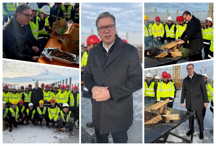 - Ovde smo na EKSPU. Siniša je obezbedio girice, ja jabuke. Bolje sam prošao. Iako je sunčano, hladno je. Divim se ovim hrabrim radnicima iz Kine, neimarima, koji rade neumorno. Neverovatan je napredak od poslednjeg puta kad sam bio ovde. Sve je već sada iznad zemlje, ispod zemlje je urađeno. Grade se konektori, gasovodi. Što se tiče EKSPA, ispred vremena smo, iza nas je stadion gde malo kasnimo, ali to ćemo da nadoknadimo do juna, jula meseca. Stvari idu odlično, budućnost upravo se gradi ovde, na EKSPU, budućnost Srbije i zahvalan svima koji u tome učestvuju i koji se bore za Srbiju, koji ne dozvoljavaju da stane, koji hoće da krene napredak zbog naše dece i naše zemlje. Sada i mi da pojedemo girice, ja sam se dosta ugrejao - rekao je Vučić.