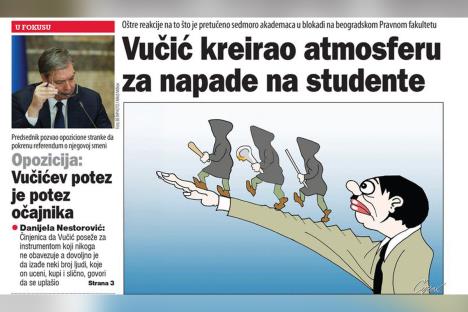 Potpredsednik Vlade i ministar unutrašnjih poslova Ivica Dačić izjavio je da sutrašnja naslovna strana Danasa predstavlja sramotan čin u istoriji novinarstva, gde legitimno i legalno izabranog predsednika Republike Srbije Aleksandra Vučića, koji uživa najveću podršku građana Srbije, porede sa Hitlerom i direktno ga optužujući da organizuje nasilje.