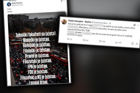 - Koliko si uzeo od stranih donatora? Hajde, nemoj da ti ja vadim papire, tebe, i oca i majke. Sad kad ti povadim ko te sve finansira, a ti kao uz studente - napisao je Georgiev.
