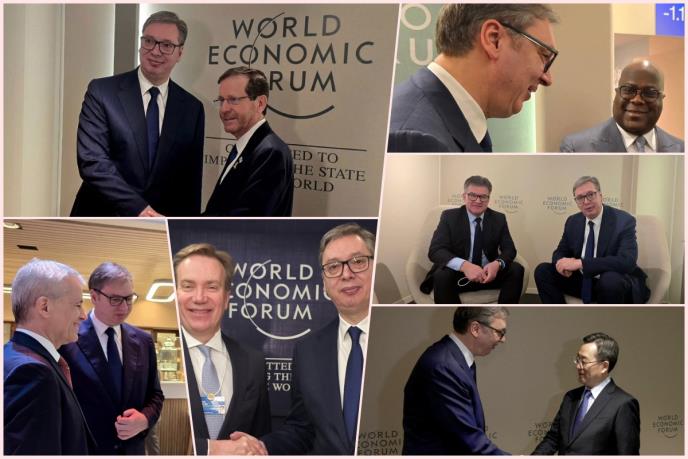 Po dolasku u Davos, predsednik Srbije susreo se juče, između ostalog, s predsednicom Evropske komisije Ursulom fon der Lajen. Najavio je da u narednih 10 dana u posetu Beogradu stiže italijanska premijerka Đorđa Meloni, kao i veliki broj italijanskih privrednika.