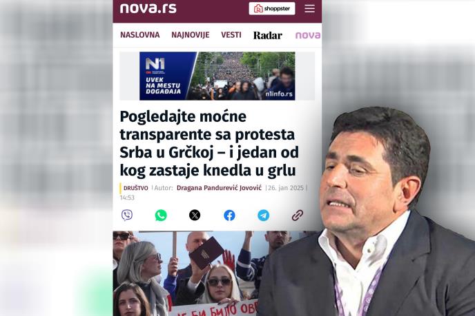 Uz to, napravljen je jedan snimak „krvave ruke“ na papiru sa uskomešanom masom Grka, učesnika protesta u pozadini. I to je to… Uz naslov u kojem piše „Protest Srba u Grčkoj“, Nova nam nekoliko desetina hiljada Grka prodaje kao Srbe. Prodaje nam priču sa duplim dnom.