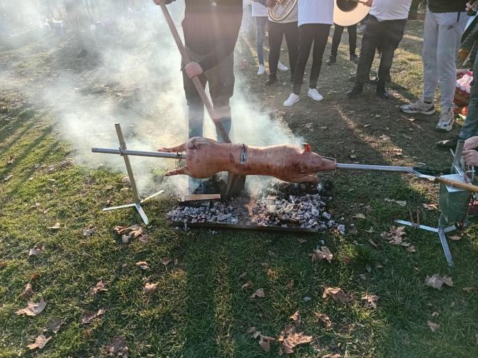 Naime, primećeno je da na skupu izvestan broj ljudi okreće prase na ražnju, a prisutni su i trubači.