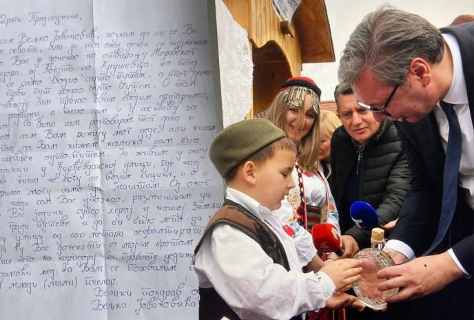 "Ne znam da li se Vi mene sećate ali ja sam onaj dečak sa šajkačom što Vas je dočekao na otvaranju Moravskog koridora od Pojata do Kruševca..., glasi tek deo pisma koje je maleni Veljko Jovanović lično napisao i poslao nikom drugom do predsedniku Srbije Aleksandru Vučiću.