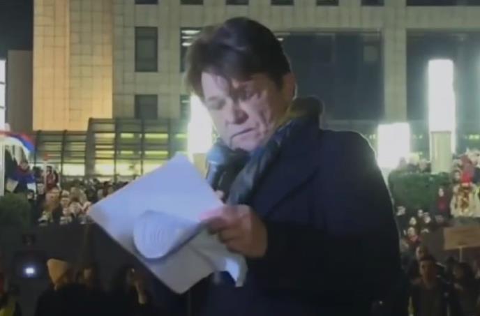 Govorimo, naravno, o osnivaču Proglasa Draganu Bjelogrliću, koji se bez stida popeo na govornicu da se obrati studentima okupljenim na blokadi Mosta slobode.
