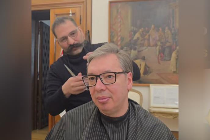 "Sad je 12 sati, u 12.05 imam sastanak. Pre toga sam iskoristio priliku da moj frizer, ili kako ja to zovem, šišač, dođe da me uredi ovo malo sede kose što imam... Ima li neka da nije seda, frizer. Teško. Kaže meni majka, sine, pobeleo si načisto", ispričao je Vučić.