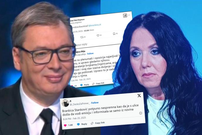 Javnost je izgleda očekivala da će Brankica Stanković tokom razgovora "rastrgnuti" predsednika Srbije, ali desilo se upravo suprotno. Istina, Vučić sagovornicu nijednog trenutka nije napao, čak i kada je ona pokazivala znake agresije, već se i tada poneo džentlmenski.