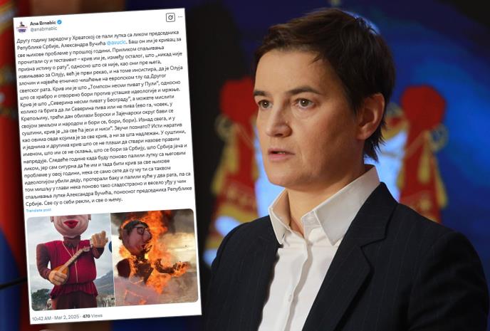 - Isti narativ kao ovima ovde kojima je za sve kriv, a ni za šta nadležan. U suštini, i jednima i drugima kriv što se ne plaši da stvari nazove pravim imenom, što im se ne sklanja, što se bori za Srbiju, što Srbija jača i napreduje. Sledeće godine kada budu ponovo palili lutku sa njegovim likom, jer sam sigurna da će im i tada biti kriv za sve njihove probleme u ovoj godini, neka se samo sete da su mu ti sa takvom ideologijom ubili dedu, proterali baku i palili kuće u dva rata, pa sa tom mišlju u glavi neka ponovo tako sladostrasno i veselo uđu u čin spaljivanja lutke Aleksandra Vučića, ponosnog predsednika Republike Srbije. Sve su o sebi rekli, i sve o njemu, zaključila je Brnabićeva.