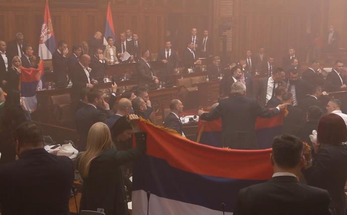 Juriš opozicije iz klupa na podijum usledio sekund pošto je utvrđen dnevni red današnje sednice. Prvo su izleteli iz klupa pred sto predsedavajuće a onda je usledio opšt haos sa dimnim bombama koji podseća na svojevremene scene iz prištinske skupštine, a više o tome možete pročitati OVDE.