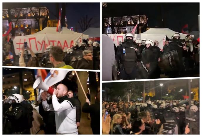 Posle protesta ispred RTS, grupa građana, studenata blolkadera i đaka došla je u Pionirski park i samo ih je kordon policije sprečio da ne uđu u kamp i napadnu studente koji su tu jer žele da uče.