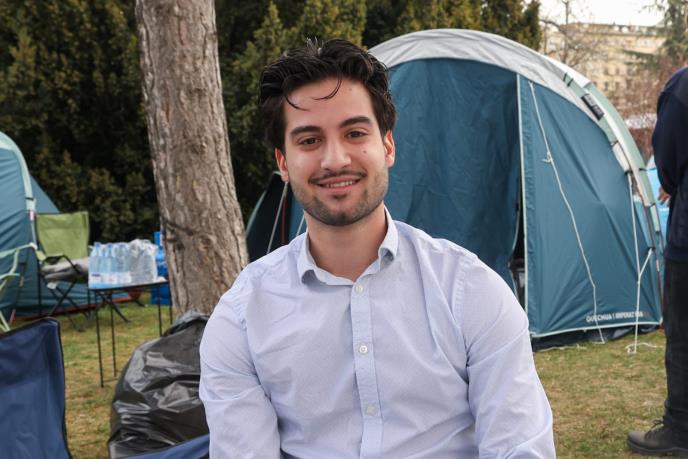 Matija Liberakos (21) povratnik iz Kanade iz koje se vratio pre godinu i po dana, u Kanadi je studirao političke nauke i sada iz Srbije nastavlja onlajn studije. On je danas došao Pionirski park da podrži studente koji hoće da uče.