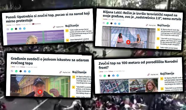 Ovo su samo neki od naslova portala Nova: „Biljana Lukić: Režim je izvršio teroristički napad na svoje građane, ovo je „nadstrešnica 2.0“, nema mrtvih”; “Građanin svedoči o jezivom iskustvu sa udarom zvučnog topa”, “Beogradski univerzitet traži hitnu istragu povodom korišćenja zvučnog topa”, “Ponoš: Upotrebio si zvučni top, pucao si na narod koji mirno protestuje“, i najjeziviji: „Zvučni top na 100 metara od porodilišta Narodni front?“.