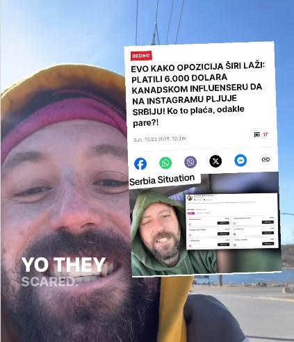 "Hej Srbijo! Hej Vlado Srbije! Pogodite šta, za petama sam vam lažljivi psi! Ozbiljno su se uplašili od bombi istine koje bacamo na njih. Ovo je članak koji mi je poslao jedan od mojih prijatelja iz Srbije u kojem oni govore da sam plaćen 6.000 dolara da napravim video u kojem kritikujem Vladu Srbije. Čoveče! 6.000?! To bi bilo lepo. Šteta što sam to uradio samo iz svog srca, bubašvabe jedne. U suštini, u članku je samo prevedn moj video, ali onda pišu da je Džon naplatio 6.000 dolara za jedan minut objave na Instagramu. To uopšte nije tačno. Iskreno, mi imamo cene za reklame/oglase, a vrlo je jasno šta je reklama. Ovi videi nisu reklame! Lažete! Zašto uvek lažete? Na kraju, ovo samo potvrđuje da je ovo što radimo istina", naveo je Viber u svojoj novoj objavi na Instagramu, očito pokušavajući da se opere nakon što se saznalo šta radi i nakoji način obmanjuje svoje pratioce, i to za novac.