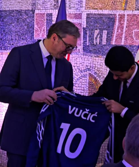 Takođe, na snimku se vidi kako predsednik Vučić dobija poseban poklon od vlasnika Pari Sen Žermena Nasera Al-Kelaifija, a u pitanju je dres sa brojem 10 na kome piše "Vučić."