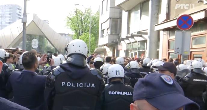 Studenti blokaderi, koji od ponedeljka uveče blokiraju ulaze u zgrade Radio-televizije Srbije u Beogradu, su otišli korak dalje i ispred RTS blokirali policiju koja je obezbeđivala radnicima te televizije da nesmetano uđu u zgradu.