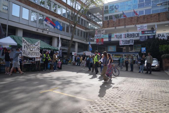 Studenti u blokadi blokiraju RTS od 14. aprila u 22 časa, a naveli su da će blokada trajati dok se ne raspiše novi konkurs za članove Saveta Regulatornog tela za elektronske medije ili "dok se ne ugasi RTS".