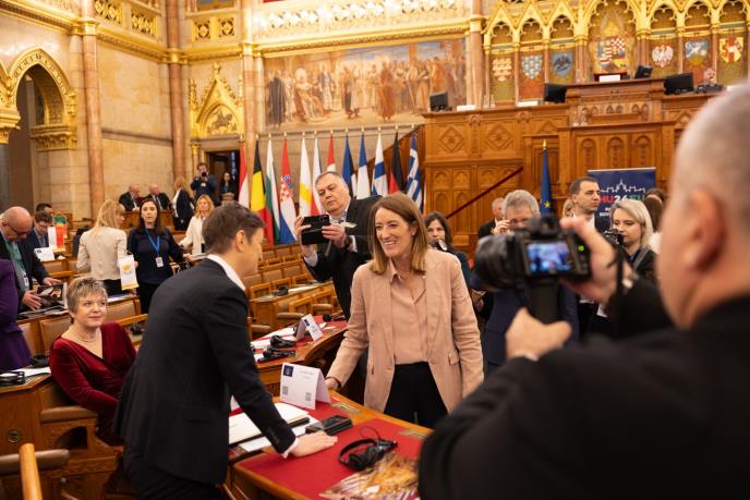 Brnabić se pri dolasku u mađarski parlament sedačno pozdravila sa predsednicom Evropskog parlamenta Robertom Mecolom, sa kojom je provela nekoliko minuta u prijateljskom razgovoru.