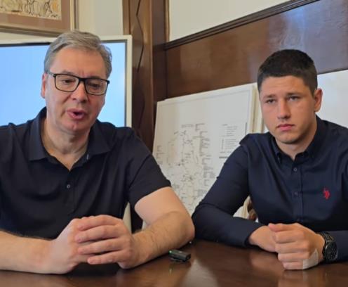 - Poštovani građani Srbije, imam čast da sedim sa... da jutros u Predsedništvu ugostim Miloša Pavlovića. Sedim sa njim i razgovaramo o stravičnim događajima prethodne noći kada je student generacije na Medicinskom fakultetu i jedan od najboljih studenata našeg Univerziteta počinio strašno delo - otišao u kafić u Studentskom gradu... i nije bio u sobi ka što lažu Šolakovi kriminalci... Težak zločin u kafiću počinio, pio kiselu vodu i koka-kolu a onda je banda blokadera došla i kao u horor filmovima opkolila kafić i počela da udara po staklu, da grebe, da škraba..., rekao je Vučić sedeći zajedno s Pavlovićem kog je jutros primio u zgradi Predsedništva.