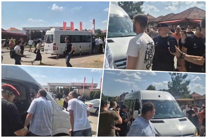 Kako se može videti na snimku, gurpa blokadera je odjednom potrčala ka kombiju i opkolili su ga. Stali su ispred vozila i počeli da viču.