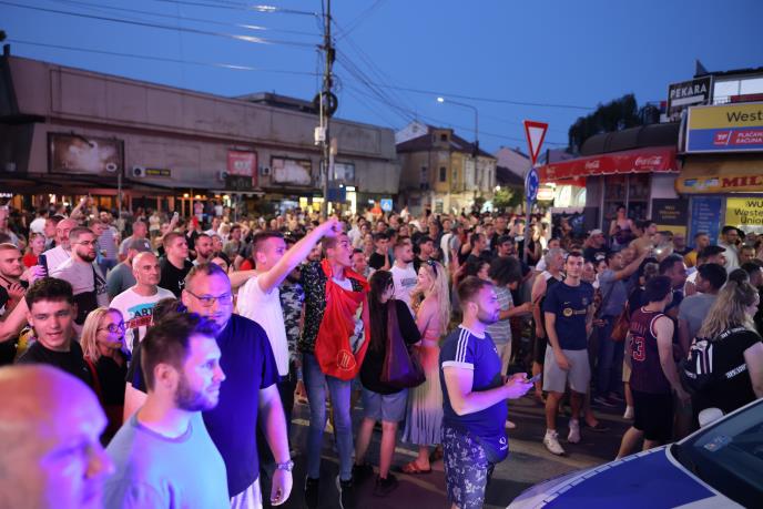 Oni uzvikuju "pumpaj, pumpaj" i "pobeda", a novinarku Informera su pokušali da ometaju dok je izveštavala sa lica mesta, javlja reporter Tanjuga.