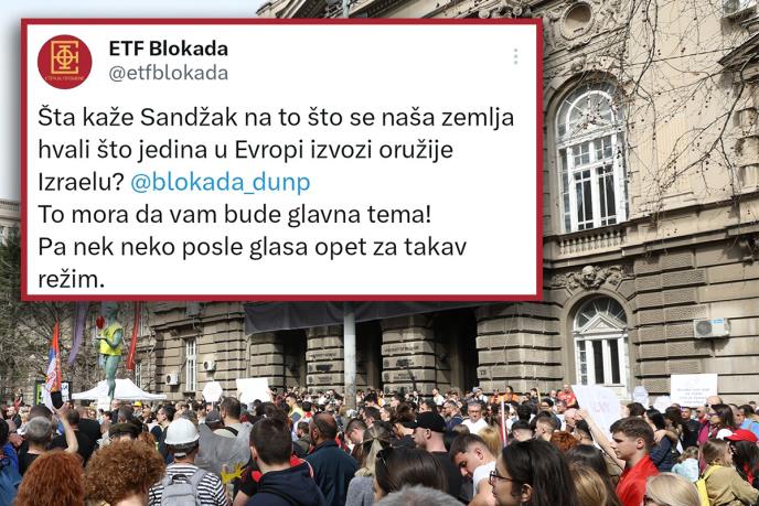 - Šta kaže Sandžak na to što se naša zemlja hvali što jedina izvozi oružje Izraelu? To mora da vam bude glavna tema. Pa nek neko posle glasa opet za takav režim - objavili su oni na Iksu.
