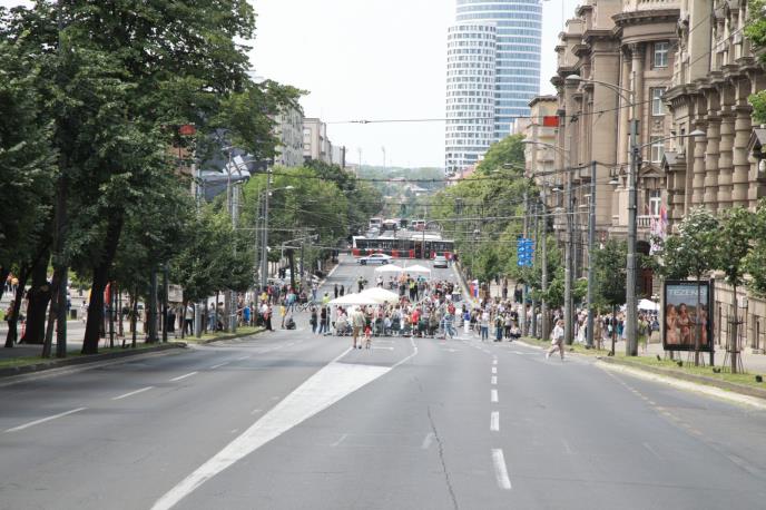 Na raskrsnici ispred zgrade Vlade Srbije, koja je jedna od najprometnijih u Beogradu, svakog dana je bio mali broj učesnika blokade, a tokom trajanja na raskrsnici su bili postavljeni šatori i metalna ograda, dok je saobraćaj bio obustavljen, a trase linija javnog prevoza su značajno izmenile svoje rute što je stvaralo velike probleme građanima i gužve u centru grada.