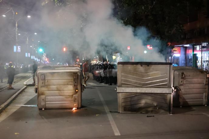 Z. L. (48) se sumnjiči da je napadao, šutirao, bacao topovske udare i flaše na policiju u Ulici Bulevar kralja Aleksandra, a I. S. (39) da je bacio kamenicu na kordon policije u Ulici Bulevar kralja Aleksandra, dok je u drugoj ruci držao još jednu kamenicu.