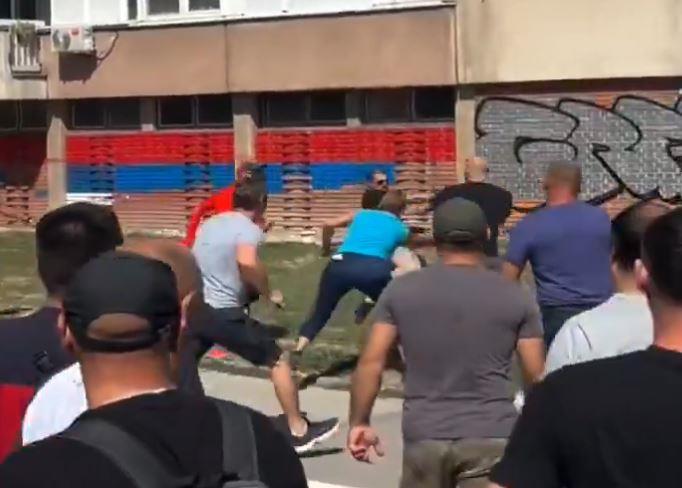 Grupa od dvadesetak ljudi ih je prvo gađala farbom, a potom su prišli sa teleskopskim palicama u rukama i počeli da zadaju udarce.