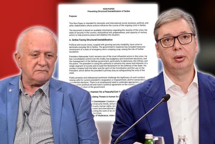 "Zbog ozbiljnih bezbednosnih izazova, poseban fokus je na ulozi predsednika, Saveta za nacionalnu bezbednost i bezbednosno-obaveštajnih službi. Ne pitanje "ko će zameniti Vučića - već kako omogućiti demokratsku smenu i miran prenos vlasti", piše u non pejperu koji je Dušan Janjić poslao 13. avgusta, a koji je kako je naveo - namenjen domaćim i međunarodnim društvenim, poslovnim, političkim i drugim akterima čije aktivnosti utiču na tok aktuelne krize u Srbiji.