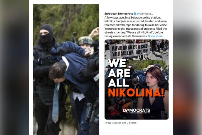 Jedan od poslednjih primera je objava Evropske demokratske partije (EDP) na društvenoj mreži Iks kojom su pokušali da ilustruju brutalnost srpske policije tokom protesta u Beogradu prema studentkinji blokaderki Nikolini Sinđelić, koja je privedena tokom nasilnih protesta ispred zgrade Vlade. Međutim, fotografija koju su objavili zapravo prikazuje hapšenje Marka Đurića, tadašnjeg pregovarača u dijalogu Beograda i Prištine, od strane specijalnih jedinica ROSU na KiM 2018. godine.