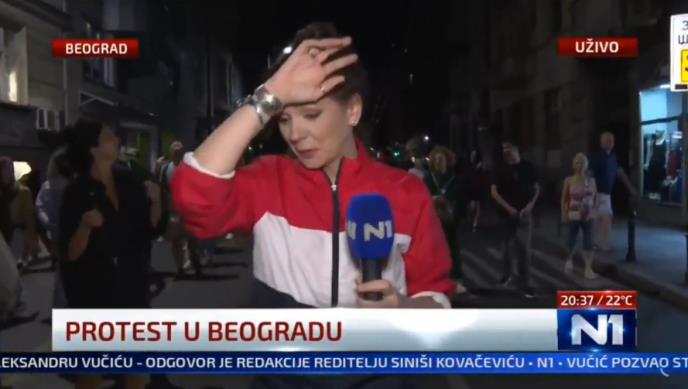 Tokom sinoćnjeg protesta u Beogradu, novinarka Šolakove televizije zatekla se u neočekivanoj situaciji dok je pratila dešavanja na terenu. Dok se kretala zajedno s demonstrantima u pravcu Vukovog spomenika, iznenada je bila poprskana nepoznatom tečnošću, što je izazvalo uznemirenost među blokaderima.
