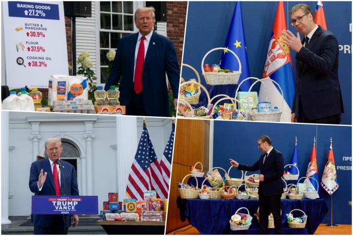 Okružen stolovima prepunim raznih namirnica, Tramp je okrivio svoju rivalku Kamalu Haris, tadašnju potpredsednicu SAD, za inflaciju koja je dovela do rasta cena robe svakodnevne potrošnje tokom mandata predsednika Džoa Bajdena.
