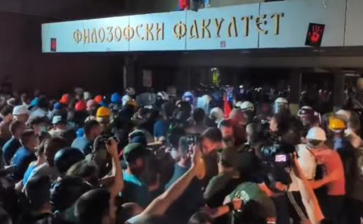U 22:20 časova, oglušavajući se na više prethodno izdatih upozorenja od strane policije, oko 300 građana pokušalo je nasilno da uđe na glavni ulaz Filozofskog fakulteta i tom prilikom nasrnuli na postavljeni kordon Interventne jedinice policije.
