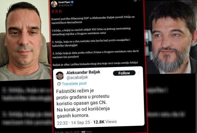 "Sramni potrčko Đilasovog SSP-a Aleksandar Baljak poredi Srbiju sa nacističkom Nemačkom!", istakao je Piper a onda podsetio na istorijske odnose Srbije prema fašizmu i u nizu komentara naglasio da Srbija nikad nije bila na strani fašizma, čak je uvek pružala otpor režimima koji su se vodili tim principom.