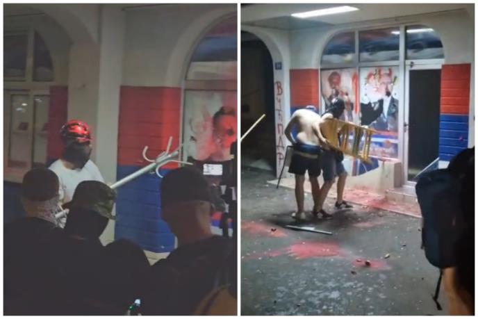 Na snimcima se može videti kako Jovičić, sa "fantomkom" i plastičnom kacigom crno-crvene boje na glavi, obučen u belu majicu i crne bermude, metalnim čivilukomrazbija staklo na prostorijama Srpske napredne stranke, potom i kamere na tom objektu.