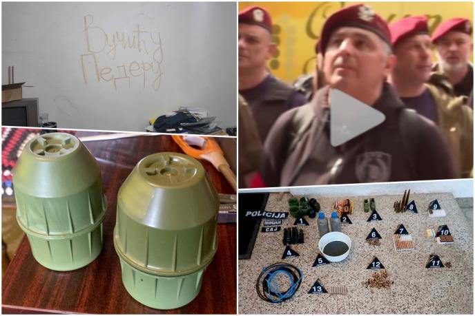 Takođe, policija je na zidu zatekla ispisanu uvredljivu poruku za predsednika Srbije Aleksandra Vučića.