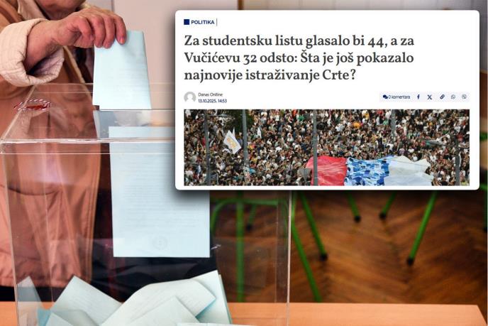 Nevladina organizacija CRTA objavila je novo istraživanje koje više liči na političku manipulaciju nego na ozbiljnu analizu javnog mnjenja. Prema CRTI, studentska lista trenutno uživa 44 odsto podrške, dok je blok okupljen oko Aleksandra Vučića navodno pao na 32 procenta. Ostatak? Nema ga nigde!