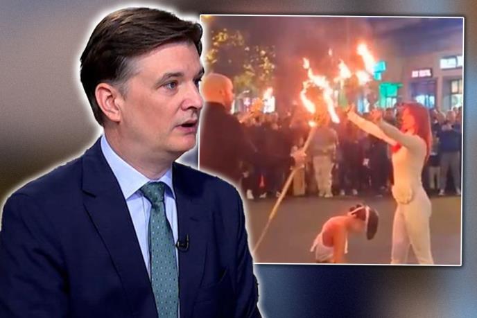 "Možda to objašnjava i nameru da spale žive ljude u prostorijama SNS u Novom Sadu. Šta je sledeće? Da prinose žrtve ritualnim klanjem i piju krv?", zapitao se Jovanov u oštrom tvitu uz fotografije sa protesta.