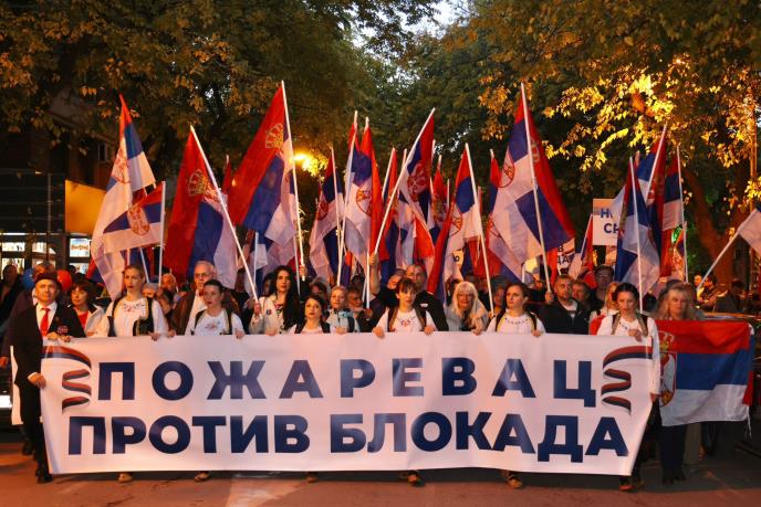 Okupljeni su nosili zastave Srbije i balone u bojama srpske zastave, kao i transparente sa porukama protiv blokada.