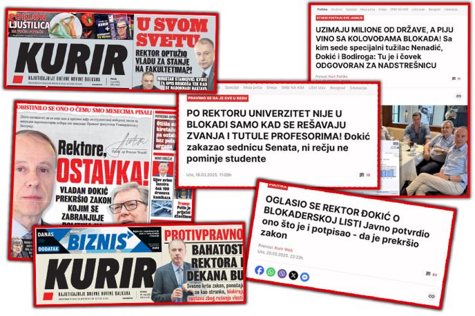 Kurir je od samog začetka blokaderskog pokreta ukazivao na rektora Đokića kao na jednu od ključnih političkih figura u svemu ovome. Na desetine tekstova smo objavili i pokušali da upozorimo na ono što se, na žalost po celo naše društvo, pokazalo kao istina: svaki potez Vladana Đokića s najodgovornije pozicije na Univerzitetu vodio je u rastakanje visokog školstva, onoga što svaka država i nacija smatraju neprocenjivomvrednošću za budućnost i dalji razvoj.