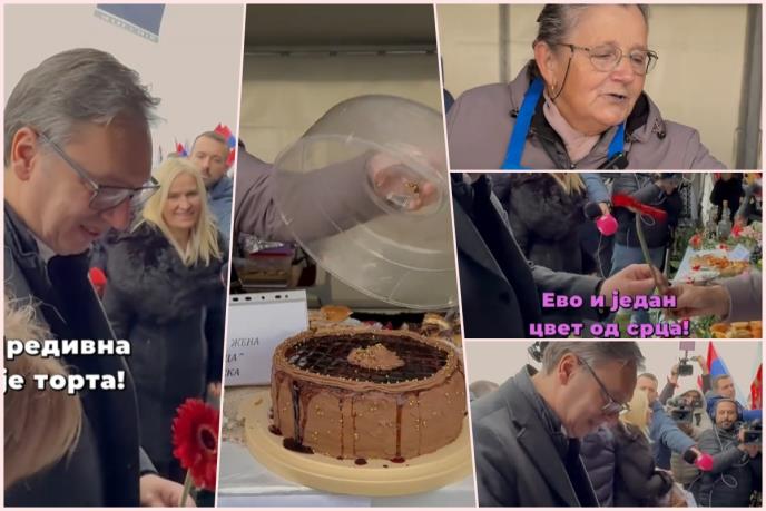 - Reforme su ponekad teške, zato je doboš torta uvek bolji izbor. Hvala udruženju žena „Danica” iz Sutjeske na ovom divnom, slatkom poklonu, poručio je predsednik Srbije Aleksandar Vučić povodom susreta koji ga je iznenadio.