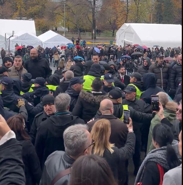 Haotične scene ispred zgrade Parlamenta, video-snimci pokazuju da je grupa opozicionih poslanika nasilno oborila metalnu ogradu, razbila šatore i fizički napala ženu koja se u tom trenutku nalazila pred policijskim kordonom.