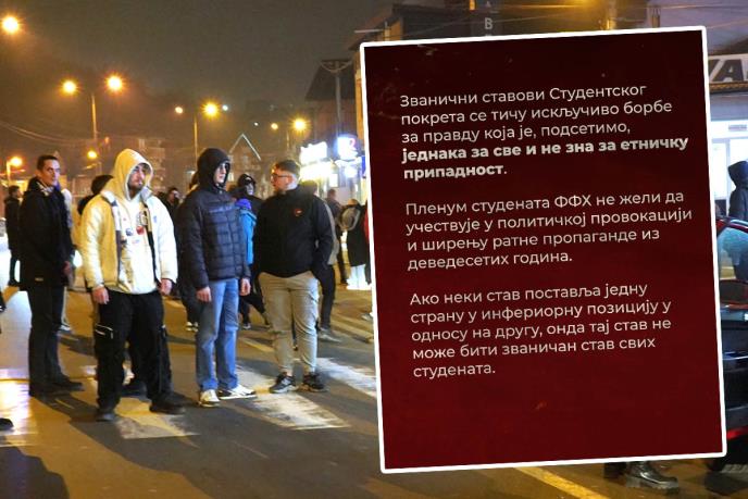 "Zvanični stavovi Studentskog pokreta se tiču isključivo borbe za pravdu koja je, podsetimo, jednaka za sve i ne zna za etničku pripadnost. Plenum studenata FFH ne želi da učestvuje u političkoj provokaciji i širenju ratne propagande iz devedesetih godina. Ako neki stav postavlja jednu stranu u inferiornu poziciju u odnosu na drugu, onda taj stav ne može biti zvaničan stav svih studenata. Svi zvanični stavovi su, kao i sve zvanične akcije, objavljeni na nalozima Studenata u blokadi (SuB) na društvenim mrežama, dok pojedinačni stavovi studenata različitih fakulteta mogu varirati. Pravda ne zna za nacionalnu pripadnost", napisali su blokaderi, što je inače prva objava ovog naloga nakon duže pauze - od 11. decembra prošle godine.