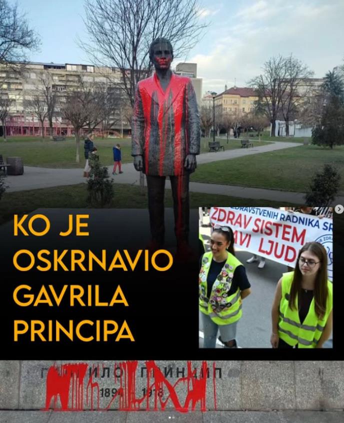 Dve blokaderke su crvenom farbom, koja je za njih simbol "prolivene krvi", polile Principov spomenik i postament sa njegovim imenom i prezimenom i godinama rođenja i smrti. Da stvar bude gora, blokaderke su se ponosno slikale pored oskrnavljenog spomenika, a ovaj vandalski čin je skandalizovao veći deo javnosti koji se zapitao da li one, ali i ostatali blokadera, uopšte znaju ko je Gavrilo Princip i za šta se borio.