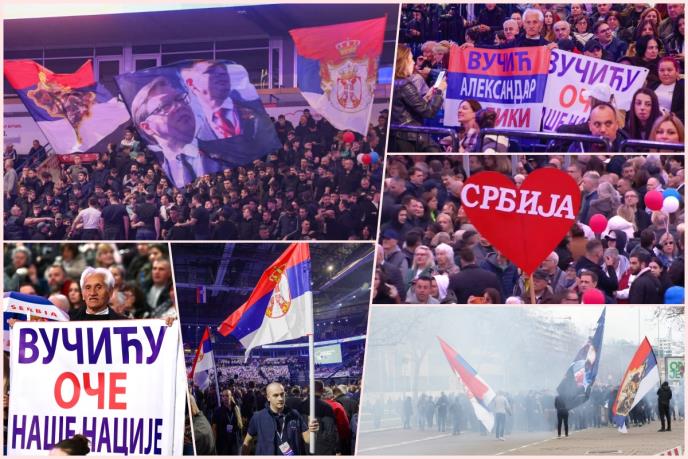 Euforija i veličanstveno raspoloženje je vidljivo među okupljenima i u Areni — koja je dupke puna i ispred Arene, te su u jednom trenutku okupljeni zapevali "Oj Kosovo, Kosovo", kao i usklici podrške predsedniku Aleksandru Vučiću.