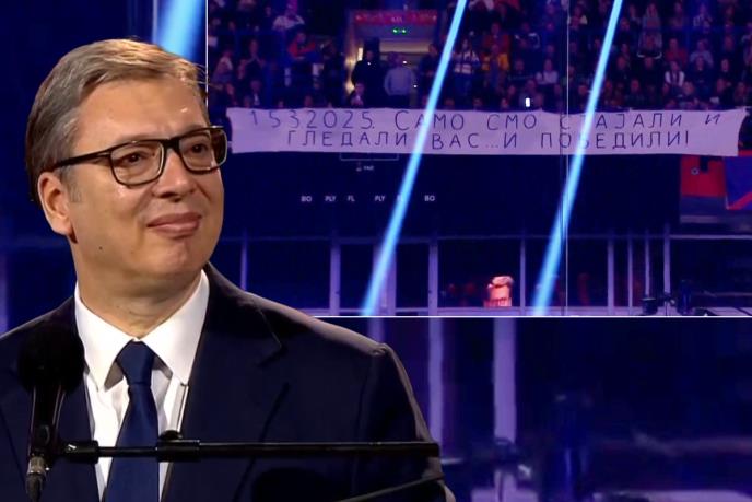"Ispred sebe vidim jedan transparent. Ne znam koliko svi drugi mogu da ga vide, u gornjem delu. Na tom transparentu neko je napisao 15.3.2025, pre godinu dana. Piše 'samo smo stajali i gledali vas i pobedili' i ja hoću da kažem da pre nešto više od godinu dana bilo teško vreme, veliko vreme za Srbiju, napadnuta zemlja s polja i iznutra. I u danu kada su hteli da konačno sruše Srbiju, u danu kada su želeli da izvedu državni udar, u danu kada su mnoge državne institucije prešle na stranu protiv države, u danu kada su mnogi mislili da će strani interesi konačno da budu ostvareni i da će Srbija biti na kolenima, vi građani Srbije, posebno vi mladi ljudi, vi koji ste taj transparent istakli, stali ste u srcu grada, u centru Beograda i rekli: 'Mi smo na braniku otadžbine, nikoga ne vređamo, ni protiv koga ništa ne govorimo. Ali smo tu i ne damo vam našu Srbiju'. Moja večna zahvalnost, ne zato što ste branili mene, već zato što ste sačuvali i odbranili našu Srbiju. I ovim našim traktoristima koji su čuvali Srbiju, koji su ostali bez svojih mašina. I vama koji ste stajali", kaže Vučić.